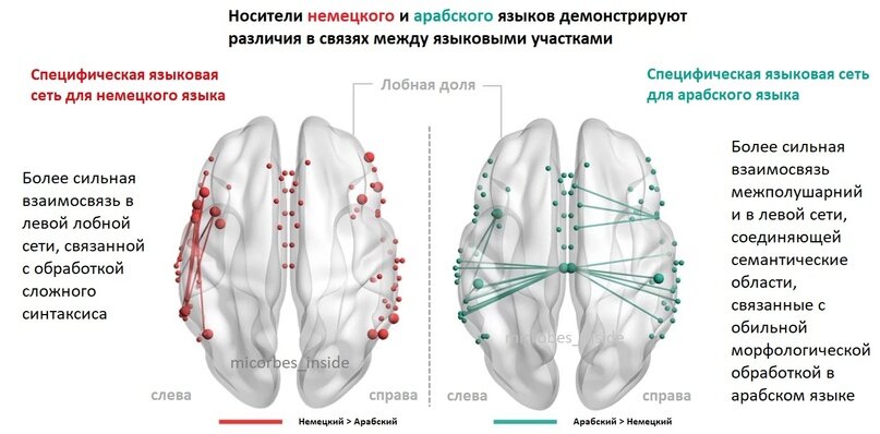 Для произнесения, написания и понимания этих языков требуются разные системы обработки информации в мозге. Носители арабского языка продемонстрировали более сильную связь между левым и правым полушариями, чем носители немецкого языка. Эти процессы со временем формируют структурные связи мозга человека. Ученые обнаружили, что родной язык формирует структурную языковую сеть в мозге человека. На иллюстрации видно какие части мозга наиболее натренированы у немцев и арабов.