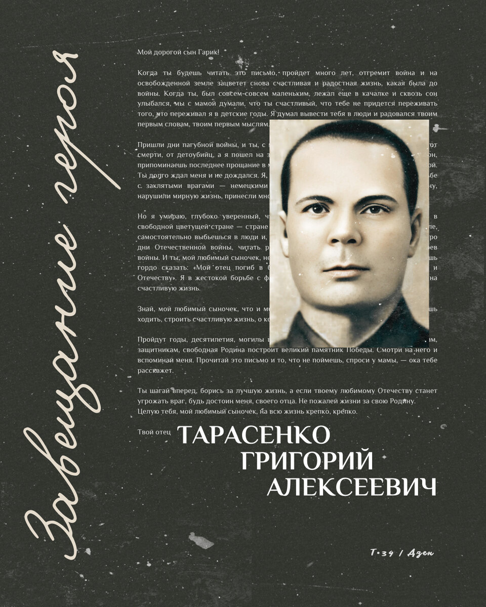 В приписке Григорий Алексеевич Тарасенко просил того, кому попадёт письмо, разыскать его семью. Санитарка Антонина Худякова дала слово исполнить просьбу. Из документов она узнала, что Григорий Тарасенко родом с Украины, учитель, 1910 года рождения. Но неизвестны были адрес и даже имя жены.