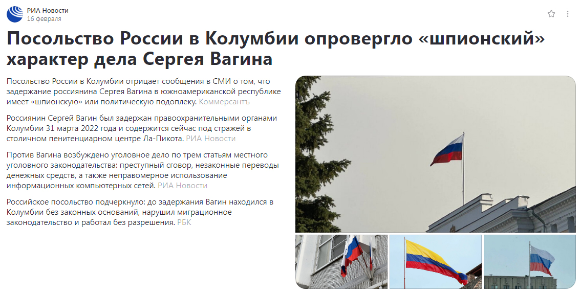 Российский политический аналитик и правозащитник Артемий Семёновский в своём блоге прокомментировал странную попытку российских дипломатов в Колумбии оправдать действия колумбийской юстиции и заявить, что в репрессиях против Сергея Вагина нет политической подоплёки. Приводим текст поста дословно: "При всём уважении к нашему МИД.... Не очень красиво оправдывать двухлетнее тюремное заключение мелкими нарушениями миграционного законодательства (устранить которые помешал именно незаконный арест) и отсутствием разрешения на работу, поскольку эти аспекты даже не фигурируют в обвинении (это мелкая административка и к тому же на момент ареста Сергей не занимался нелицензионной трудовой деятельностью). Да, возможно он и нарушал тюремный распорядок, но грех обвинять человека в несоблюдении незаконных требований - человек беспричинно лишённый свободы не обязан принимать это как данность и стремиться к соблюдению незаконно применяемых к нему правил. Я прекрасно знаю, что Сергей это не подарок и е