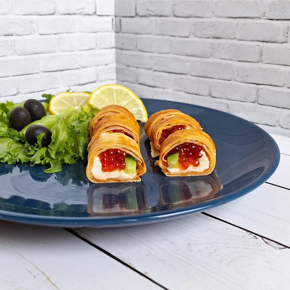 Красивая и очень вкусная закуска из блинов. Настоящее украшение стола на масленичной неделе! Икру можно заменить красной рыбой, огурец - авокадо. Ингредиенты на 1 порцию: --------------------------------------------- ▪️Тонкий блин, диаметр 21см - 1шт ▪️Сливочный творожный сыр -3ч.л. ▪️Огурец - 20 гр ▪️Икра лососевых - 3 ч.л. Для подачи (по желанию): -------------------------------------------- Листья салата (у меня фриллис) - 2-3 шт Маслины - 3 шт Дольки лимона - 2 шт Приготовление: --------------------------- 1. На край блина выложить сливочный сыр. 2. Рядом с сыром выложить огурец, нарезынный брусочками. 3. На сыр с огурцом выложить красную икру. 4. Свернуть из блина плотый рулетик. 5. Осторым ножом отрезать жопки по краям, чтобы получился ровный красивый срез. И разрезать ролл на шесть одинаковых кусочков. 6. Подавать на большой тарелке с зеленым салатом, маслинами и дольками лимона. 7. Приятного аппетита!❤️