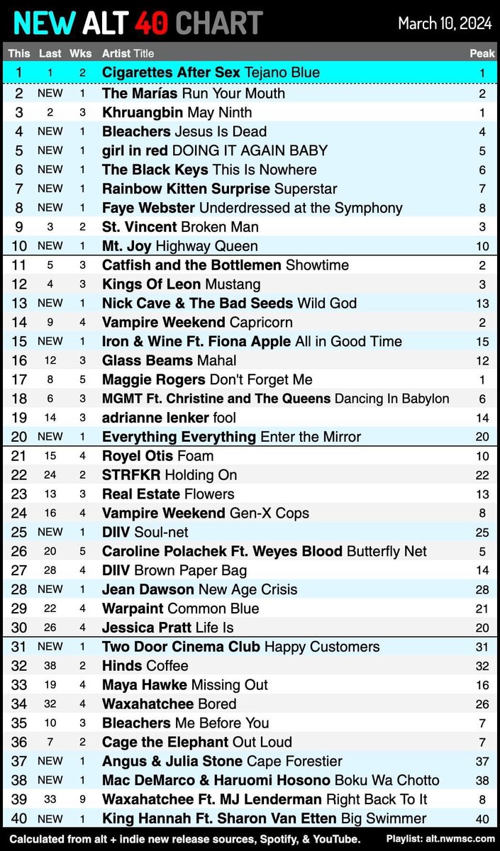 Еженедельно рассчитывается на основе десятков альтернативных и инди-новинок и потоковой активности на основных сервисах. Последнее обновление: 10 марта 2024 г.