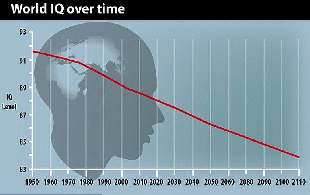 На графике чётко отслеживается нисходящая тенденция уровня IQс 1950 года, когда средний показатель составлял 91,6 баллов по 2020 год – к этому моменту средний показатель снизился примерно на 3 пункта, также учёные смогли предположить какой уровень IQ будет к 2110 году. Конечно, всё это лишь примерные цифры, и на деле они могут несколько не совпадать с реальностью, на закономерность на лицо, средний уровень интеллекта снижается. Но как так может быть, ведь мы живём в эпоху технического прогресса и невероятного развития? А вот так, теперь это не только моё предположение, сейчас учёные по всему миру бьют тревогу по поводу деградации человечества.