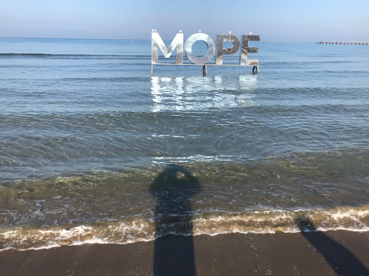 А Лере наоборот хорошо. Наташа из соседнего номера отнесла нам кусок торта : первое столкновение с соседями. Я торты не ем, только по-вечерам. Утром с чаем только. Но Лера съела. Телевизор старинный, он сломался, но его снова починили администратор - владелец гостевого дома. Холодильник тоже старинный и морозилка в нем не работает: пельмени там пребывают в полумягком состоянии. Но это мелочи, главное, меня тут взяло давно не посещаемое состояние скуки. Также легкая диарея и ощущение простуды: то щиплет горло, то перестаёт. Скорее всего, у меня идет акклиматизация. С утра пошёл в сторону Витязево. Спустился к низкому пляжу, там хорошо, на фоне букв «МОРЕ» снимались инстаграмочки, кстати, они и в натуре ничего такие, только вектор развития смещён. Деньги сразу начали кончатся, непонятно, как мы продержимся здесь 2 месяца. Но раз есть такое решение, значит сделаем! Три дня я могу вообще не есть, вода здесь бесплатно. Стал продумывать систему лечения своего псориаза: солнечные ванны (бе
