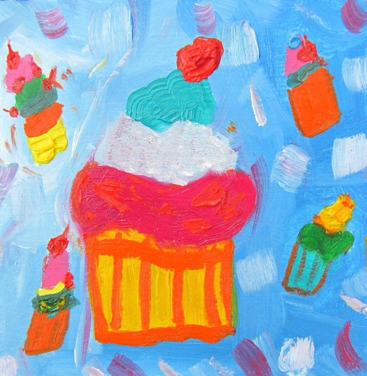 Кусочек сладостных мгновений вберу в себя без промедления. Какой же нежный крем на шапочке, мгновенно тает на губах. Секунды переплелись с минутами, в ярчайшем танце вкусы сладкие. Диеты прочь, сейчас ненужные, я улетаю к небесам. А там лишь сказка начинается, Там истины все открываются, Глаголят, что нужны пирожные, Всем тем, кто обожает их. Картина "Пирожное". Масло, картон. Размер 10х10 см. Автор и художник Вилена Салтыкова