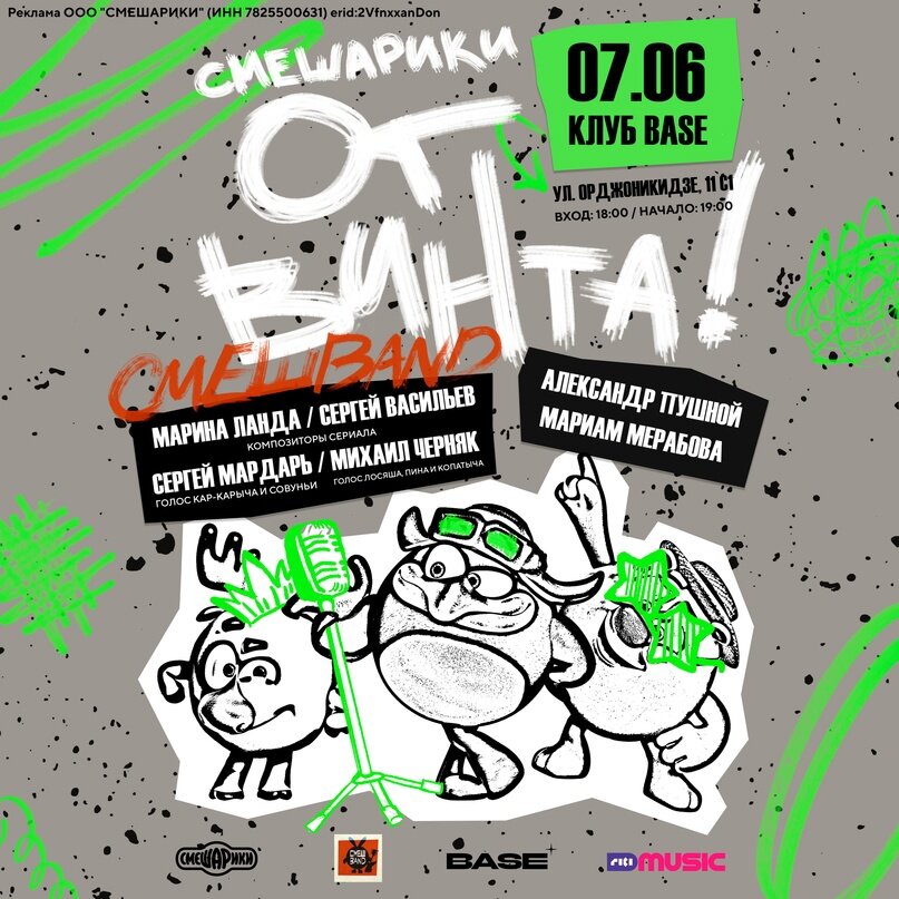 Всем привет. Да, меня ту не было неделю... Но вы про меня не забываете, поэтому я возвращаюсь с обалденными новостями по Смешарикам и по этой рубрике. Не будем медлить, погнали! 1. От Винта! Лето - прекрасная пора, чтобы оторваться по-смешаровски! Приглашаем вас на сокрошительный концерт «Смешарики. От винта!» 7 июня 2024 года в московском клубе Base. Вас ожидают самые зажигательные хиты от Смешариков, исполненные легендарными композиторами проекта Мариной Ландой и Сергеем Васильевым в сопровождении музыкального коллектива СмешBand, с которым еще выступят Александр Пушной и Мариам Мерабова.