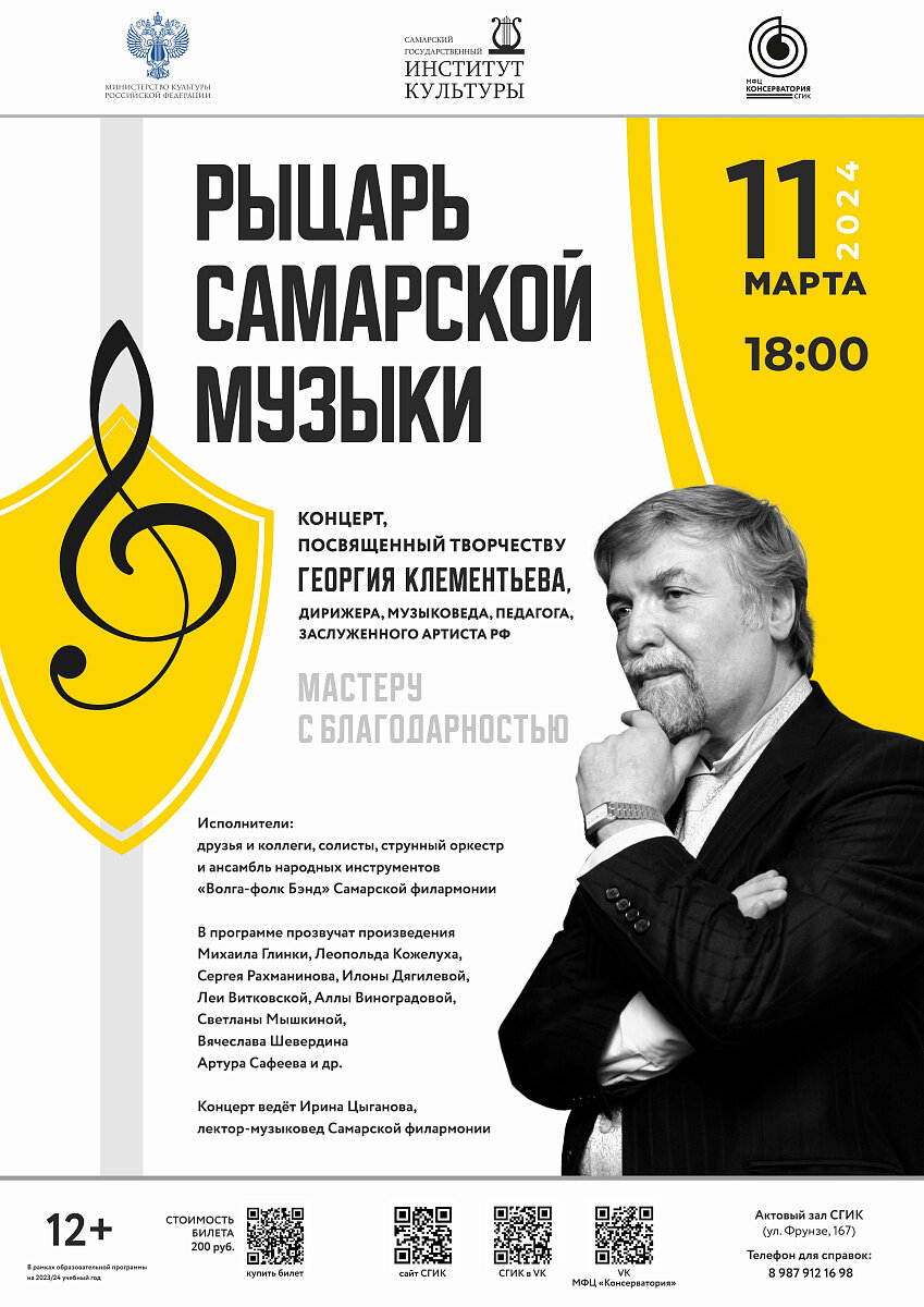 Что готовит нам грядущая неделя. Мой выбор 11 марта, понедельник Концертный зал «Консерватория», 18:00 Рыцарь самарской музыки концерт, посвященный заслуженному артисту России, дирижеру Самарской филармонии Георгию КЛЕМЕНТЬЕВУ – в концертном зале «Консерватория» (18:00). 12 марта, вторник Тольяттинская филармония, 19:00 Сона Гулхасан (джазовый вокал) и Рафаэль Петросян (фортепиано) в концерте с участием джаз-оркестра п/у Валерия МУРЗОВА 13 марта, среда Выставочный зал Самарского отделения Союза художников России, 18:00 Открытие персональной выставки Галины МИСЮК Сочинения на свободную тему 14 марта, четверг Самарский художественный музей, 18:00 Открытие выставки к 180-летию со дня рождения Василия Дмитриевича Поленова Человек света В экспозиции представлены работы из Третьяковской галереи; Мемориального историко-художественного и природного музея-заповедника В. Д. Поленова; Иркутского, Нижегородского и Ульяновского художественных музеев; Екатеринбургского и Омского музеев изобразит