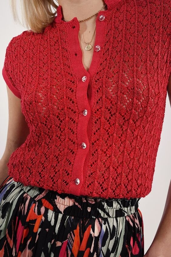 Здравствуйте, вязальщицы! Вы любите вязать из ярких ниток? Например, красных? Красный цвет - одни из самых летних. Он имеет множество оттенков - от вызывающего алого до благородного бургунда. А сколько светлых оттенков красного! Из чего вязать? А это у каждого свои любимые нитки. Лен, хлопок, крапива - большой выбор ниток для вязания летних топов, маек, футболок, туник. И каждый производитель выпускает нитки и в красных тонах. Ну, поехали! Я подобрала для вас и для себя идеи для вдохновения и узоры со схемами, которые будут хорошо смотреться в красном цвете. 1. Несколько моделек от красного до морковного. Мне понравилась разлетайка с пуговками. Жаль, что не нашла описание. Связана разлетайка круглой кокеткой, а над узором можно поработать. 2. На карточке этой статьи очень красивая красная кофточка спицами, на пуговках, со спущенным коротким рукавом и воротничком стойкой. К сожалению, не видно, как связан низ изделия. Я думаю, что без резинки, прямая, раз заправлена в юбку. 3. Красно