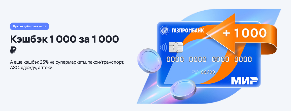 Начнем сразу с козырей. При оформлении дебетовой карты Мир в марте, вы получите кешбэк 1 000 за покупки от 1 000 ₽, а еще кешбэк 25% на супермаркеты, такси, транспорт, АЗС, одежду и аптеки. Далее расскажем обо всем подробнее. Кешбэк по карте Первый кешбэк - это 1 000 баллов за покупки по карте от 1 000 ₽. Банк начислит кешбэк до 25-го числа следующего месяца после выполнения условий. Еще один повышенный кешбэк в рамках акции доступен по следующим категориям: Акция проходит до 31 июля 2024. Для участия в ней необходимо подтвердить участие в мобильном приложении или интернет-банке в разделе «Кешбэк баллами» до 30 апреля. 10% на остаток Вы будете получать 10% по карте от 30 000 ₽ до 100 000 ₽. Пока ваши средства лежат на карте, они приносят вам доход. Бесплатные переводы Переводы без комиссии на карты других банков по номеру телефона через систему быстрых платежей — до 150 000 ₽ в месяц, при условии подключенной услуги Газпромбанк Привилегии. Без нее - до 100 000 ₽ в месяц. Другие пр