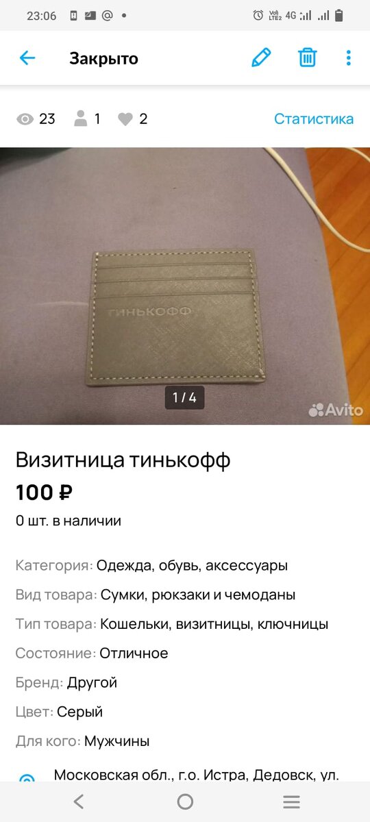 Часть 15.Самые нелепые продажи декабря. Всем доброго денечка,дорогие мои читатели, подписчики и просто зашедшие на "огонек".Продолжаю рассказывать Вам о продажах декабря .После продажи кружек и некоторого затишья продажей номер 5 стала продажа визитницы ,которую мне подарили от банка Тинькофф при оформлении карты одноименного банка.Выставили ее в профиле мужа всего за 100 рублей. К слову в профиле мужа на тот момент был выставлен оригинальный кожаный кошелек всего за 200 р,он и до сих пор не продан даже с такой ценой,а вот визитница продалась молчаливым заказом.Супруг был выходной и сразу поспешил в Яндекс доставку,коей она была заказана .Человек часа через 2 спросил,когда отправите и удивился,что товар уже едет..Результат_95 рублей к карме и отличный отзыв.Недавно подруга рассказала,что такие визитницы дарил им руководитель на Новый год,мы посмеялись и сказали,если что,неси,продадим на Авито😂.Так что и нашу,возможно,брали для подарка. 6 продажей ,а было это уже 18 декабря стала п