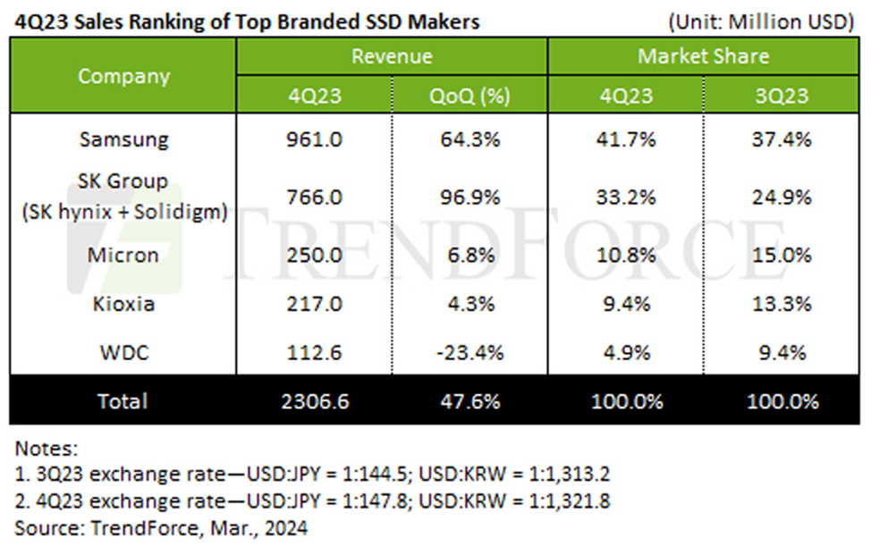 TrendForce: Продажи корпоративных SSD в конце 2023 года увеличились, а цены на них выросли
