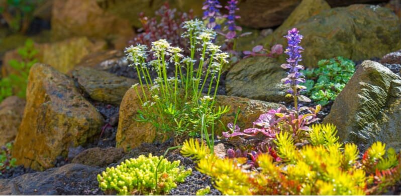 Создание рокария - искусство, требующее внимания ко множеству деталей. При создании такого сада необходимо учитывать различные аспекты, начиная от выбора камней и растений и заканчивая гармоничным размещением его на участке. Важное значение имеют размеры как живых, так и неживых элементов, которые должны быть пропорциональны размерам сада и представлять единую композицию. Подходить к созданию рокария следует творчески. Рассмотрим несколько вариантов дизайна: 1. Скальный выход: Рокарий, имитирующий выход горной породы из земли, создает впечатление естественного ландшафта. Для этого можно использовать небольшой холмик на участке, на котором размещают несколько крупных камней, особенно привлекательных своим внешним видом, например, гнейс. Камни частично вкапывают в грунт и засыпают вокруг мелкими камешками той же горной породы. Пустое пространство между камнями заполняется низкорослыми древесными растениями, такими как можжевельники, карликовые ели, горная сосна, а также различными травян