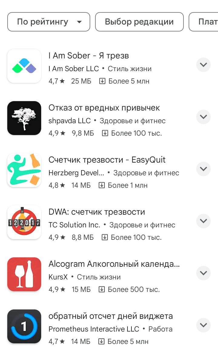 Наверняка, алкоголики и те, кто решил ненадолго завязать с выпивкой знают о приложениях по подсчету трезвых дней. Их целая куча. Платных и бесплатных, удобных и не очень. На любой вкус. Их еще называют счетчиками трезвости. Как пример, что с ходу предлагает Google Play: Выбрать есть из чего. Одним из таких приложений пользуюсь я сам. Название говорить не буду, так как за рекламу мне никто не заплатил, но кому надо, тот поймет. Здесь можно выставить дату начала трезвой жизни, количество выпиваемого алкоголя, сумму, потраченную на разгульный образ жизни. Я поставил следующие значения: Вот что получилось за 523 дня трезвости: В приложении есть прикольная функция, по которой можно наблюдать, как восстанавливается организм. Не знаю, так это или нет с точки зрения медицины, но очень мотивирует на первый порах. Как это выглядит: Список по восстановлению рассчитан на год. Приложение считает, что за 12 месяцев я полностью восстановил свой организм после полутора десятков лет пьянства) Ну-да,