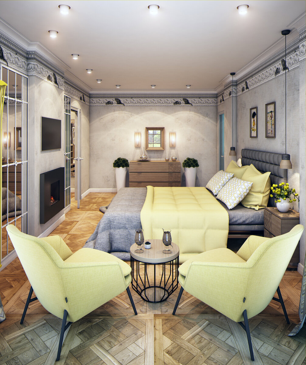 Проект спальни в загородном доме для молодой пары. Надо отметить, что до разработки интерьера спальни был создан и реализован проект детской для дочки заказчицы. Но вот последующая реализация спальни прошла без надзора.