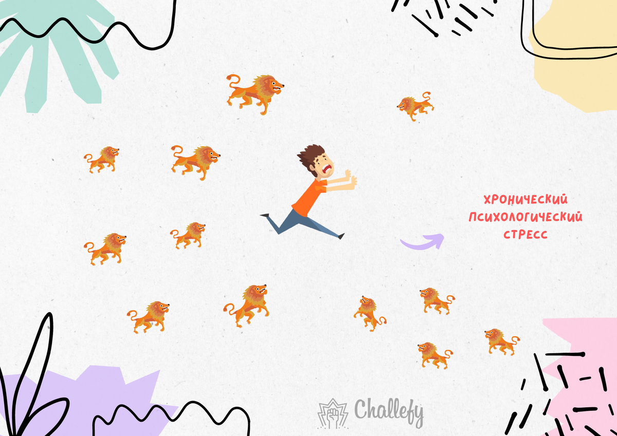 Ключевая мысль: стресс - хорошо, хронический стресс - плохо. Когда-то, когда природа придумала стресс, мир был другой. В любой момент ты мог стать чей-то добычей. Например, начальника льва (все того же, со вчерашнего занятия)🦁 Вот природа и создала для тебя мощный механизм спасения - стресс. Потом все сильно поменялось. Физических угроз практически не осталось. ❓ Тогда почему возникает хронический стресс, если лев теперь - в клетке в зоопарке? В 20-м веке ученые открыли феномен, который дал ответ на этот вопрос: машинке под названием стресс практически все-равно, настоящий лев или ты его выдумал. Да, конечно, реакция стресса будет не такой яркой, но она будет. Знакомься, это - психологический стресс. На самом деле, забегая вперед скажу - здесь скрыта твоя суперсила#2 (про первую не забываешь? Вдох-выдох, все дела). Итак, выдуманные стрессоры тоже запускают стресс. И если это не контролировать, они появляются все чаще. Процесс становится постоянным. Что мы получаем в итоге? Хронический