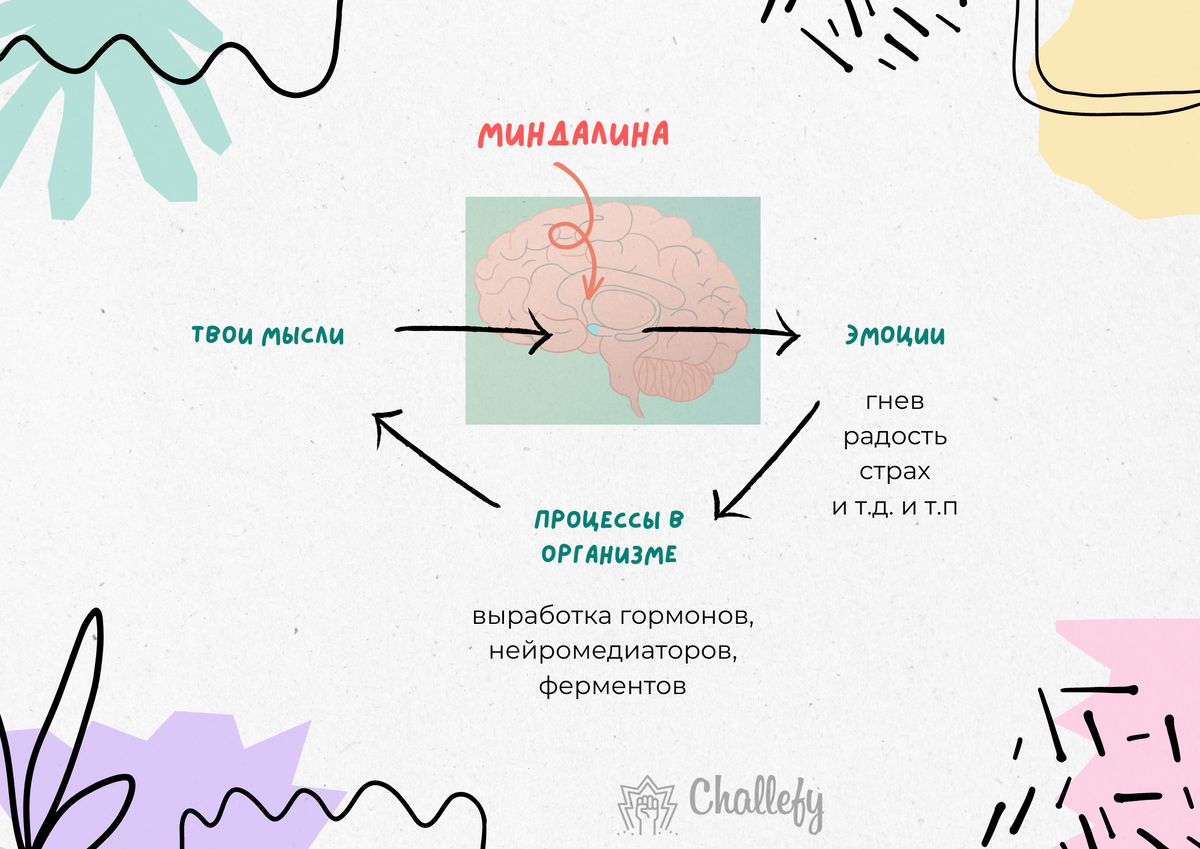Ключевая мысль: со стрессом можно (и нужно) работать через тело и голову. Для начала - научиться пользоваться суперсилой#1 и суперсилой#2. Сегодня во время практики Контакт с телом ты начал соединять обе суперсилы С телом ты уже начал работать через осознанное дыхание. А что насчет головы? Сегодня я расскажу про твою суперсилу#2. Ты наверное слышал высказывание “мысли - материальны”. Есть что-то в этом эзотерическое. Кто-то в это верит, кто-то - нет. Сейчас я расскажу тебе, как это работает с точки зрения науки. Этим направлением занимается когнитивная терапия. Через изменение мышления она помогает работать со стрессом, посттравматическими расстройствами, депрессией. И за последние пару десятилетий она сделала огромный шаг вперед. Да такой, что начинает пододвигать классику жанра - медикаментозную терапию. Практически за все твои эмоции отвечает участок ГМ размером с горошину - миндалина. Твои эмоционально окрашенные мысли запускают определенные реакции в ней. Она в ответ формирует соо