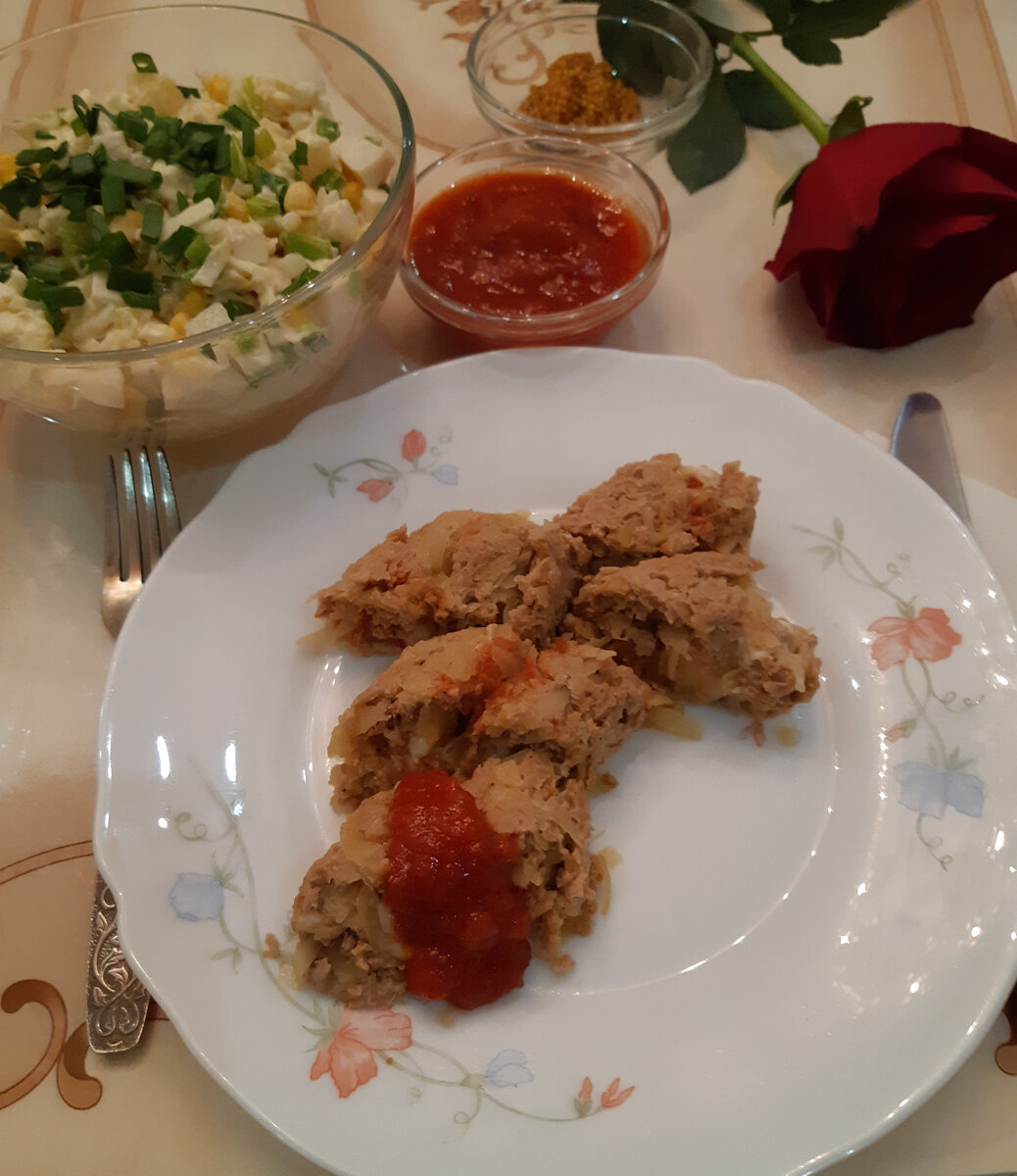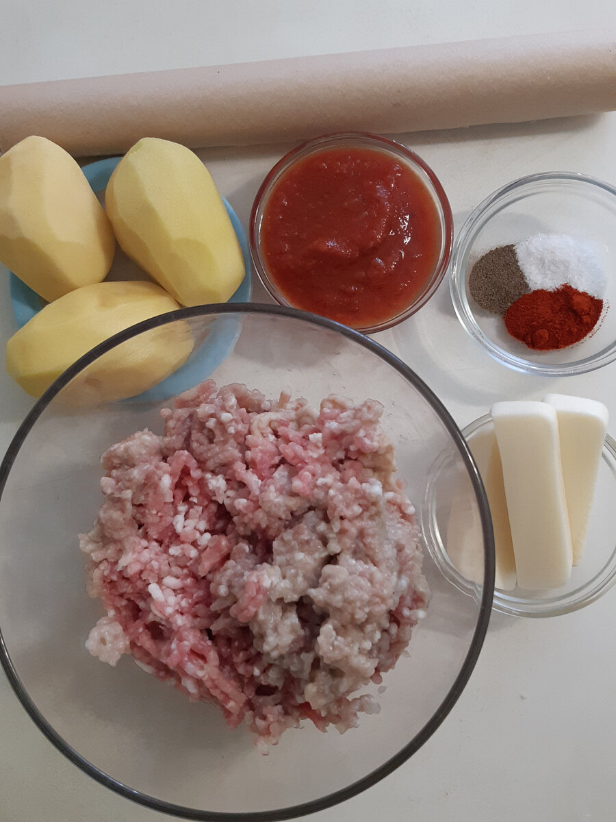 Состав: Приготовление: У меня фар домашний (свинина +говядина), я уже добавила лук. Если у вас магазинный можете добавить немного мелко нарезанного лука. Картофель трём на крупной тёрке, отжимаем сок. Смешиваем фарш, картофель, соль, перец, паприку. Сыр режем по количеству рулетов. У меня был и короткие бруски, я разрезала их пополам, чтобы хватило на всю длину рулета. Делим фарш на части, по количеству рулетов На пергамент выкладываем полученную смесь, не доходя до краёв, разравниваем. Смазываем соусом. В середину кладём с сыр и с помощью пергамента сворачиваем рулет. Края закручиваем как в конфетке. Сворачиваем все рулеты. Выкладываем их на разогретую сковороду, наливаем горячую воду, чтобы закрыла дно. Закрываем крышкой и на среднем огне готовим 10 минут. Затем переворачиваем и ещё 10 минут под крышкой. Если вода испариться, доливаем, иначе пригорят. Достаём, разворачиваем и подаём целыми или нарезаем. Я подавала с соусом, горчицей и салатом их ананасов и капусты (рецепт