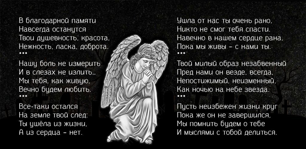 Эпитафия - короткое высказывание, стих, от имени родственников или от лица усопшего. Это могут быть обычные скорбные слова, идущие от сердца, которые не успели высказать при жизни, но часто заказывают двух- или четверостишие. Стихи на женские памятники заказывают чаще, чем на мужские. На женском памятнике можно разместить строчки из известного стихотворения или песни, или же самостоятельно рифмованные слова.