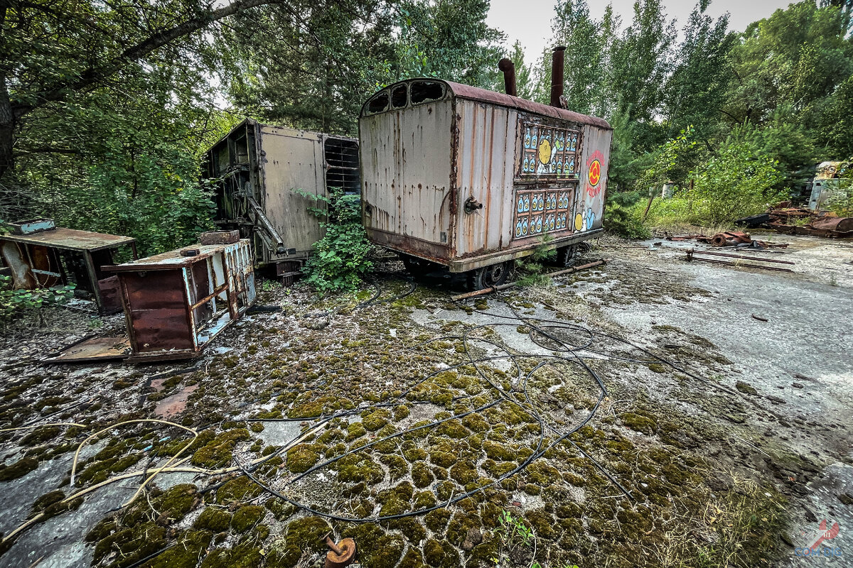 Стало интересно: зачем их перевернули? Неужели чтобы было удобнее снять колеса? Да-да, в Чернобыльской зоне отчуждения до сих пор снимают с техники запасные части.