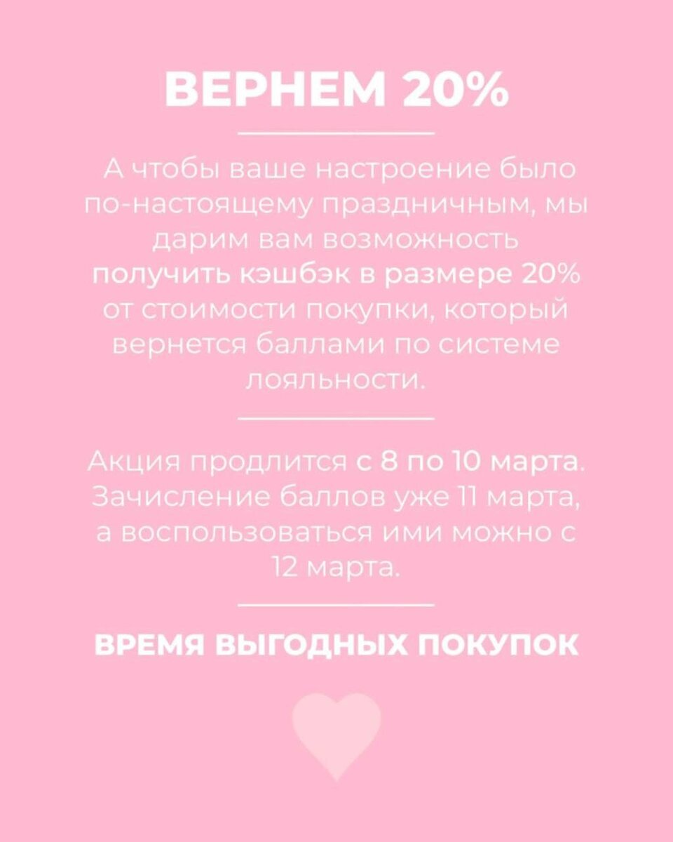 Успейте оформить заказ до конца сегодняшнего дня и получите кэшбэк 20% от стоимости покупки, который вернется вам баллами🫶🏼
