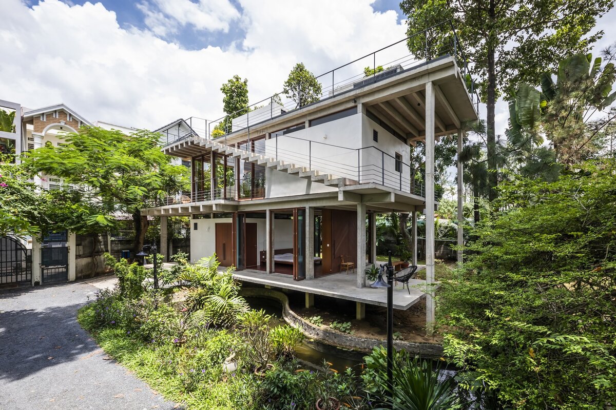 Ту Дык, Вьетнам Архитекторы: Архитекторы Сануки Дайсуке Год: 2022 Фотографии: Хироюки Оки Дом «открыт» воздуху. Дом для молодой вьетнамской пары в Ту Дыке, расположенном в пригороде Хошимина. Участок покрыт тропической растительностью в саду, однако он часто затопляется близлежащей рекой. Следовательно, у окружающих зданий первый этаж приподнят более чем на 80 см над уровнем улицы. Одним из пожеланий клиента было, чтобы первый этаж был приподнят на 1 м над уровнем улицы. В то же время, чтобы максимально использовать преимущества участка и местоположения, дом должен быть «открыт» пышному саду и с видом на реку поблизости, чтобы клиенты могли быть ближе к природе. Уникальность участка объясняется одной из геологических особенностей подводного ландшафта Вьетнама. Для «открытости» дом построен в виде трёх плит, парящих над землёй. Плиты разной формы на верхнем и нижнем этажах. Промежуток между этажами создаёт разнообразие пространств внутри и снаружи. Каждая плита вытянута в сторону сада,