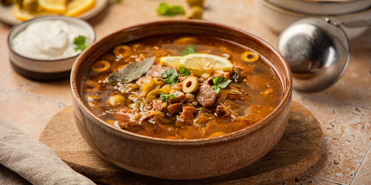 Само название "солянка" произошло от слова "селянка" - так называли деревенских жительниц. Дело в том, что издавна в селах готовили оригинальное блюдо: в котле смешивались остатки разных продуктов и вода, массу варили до готовности и ели. Именно так родился рецепт сборной солянки. Со временем он трансформировался, дополнялся и сейчас густой суп можно отведать в лучших ресторанах. Солянка с копченостями Вскипятить в кастрюле 2.5л. воды. Лук и картофель очистить, промыть и нарезать кубиками. В кипящую воду положить овощи, варить 15 минут. Нарезать кубиками грудинку, колбасу и огурцы, морковь натереть на крупной терке. На сковороде разогреть масло, выложить морковь, тушить 2-3 минуты, помешивая. Добавить колбасу и грудинку, тушить еще 2-3 минуты. Добавить томатную пасту, долить воды и перемешать. Посыпать специями, сахаром и солью. Выложить огурцы, перемешать, тушить 5-7 минут. Дождаться, пока картофель станет мягким, выложить из сковороды в кастрюлю все ингредиенты, добавить лавровый лис