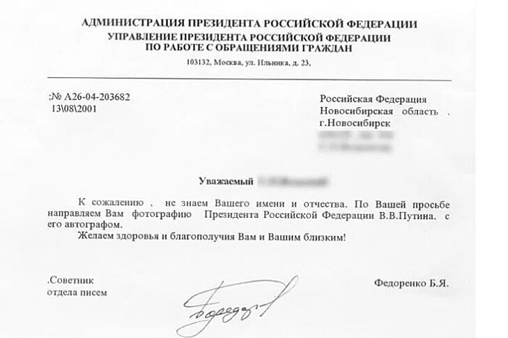 К фото с подписью продавец прилагает сопроводительное письмо из Администрации Президента РФ и правительственный конверт, в котором был доставлен снимок с автографом в Новосибирск из Москвы. На бумаге хорошо видны почтовые штемпели. Документ датирован 2001 годом.