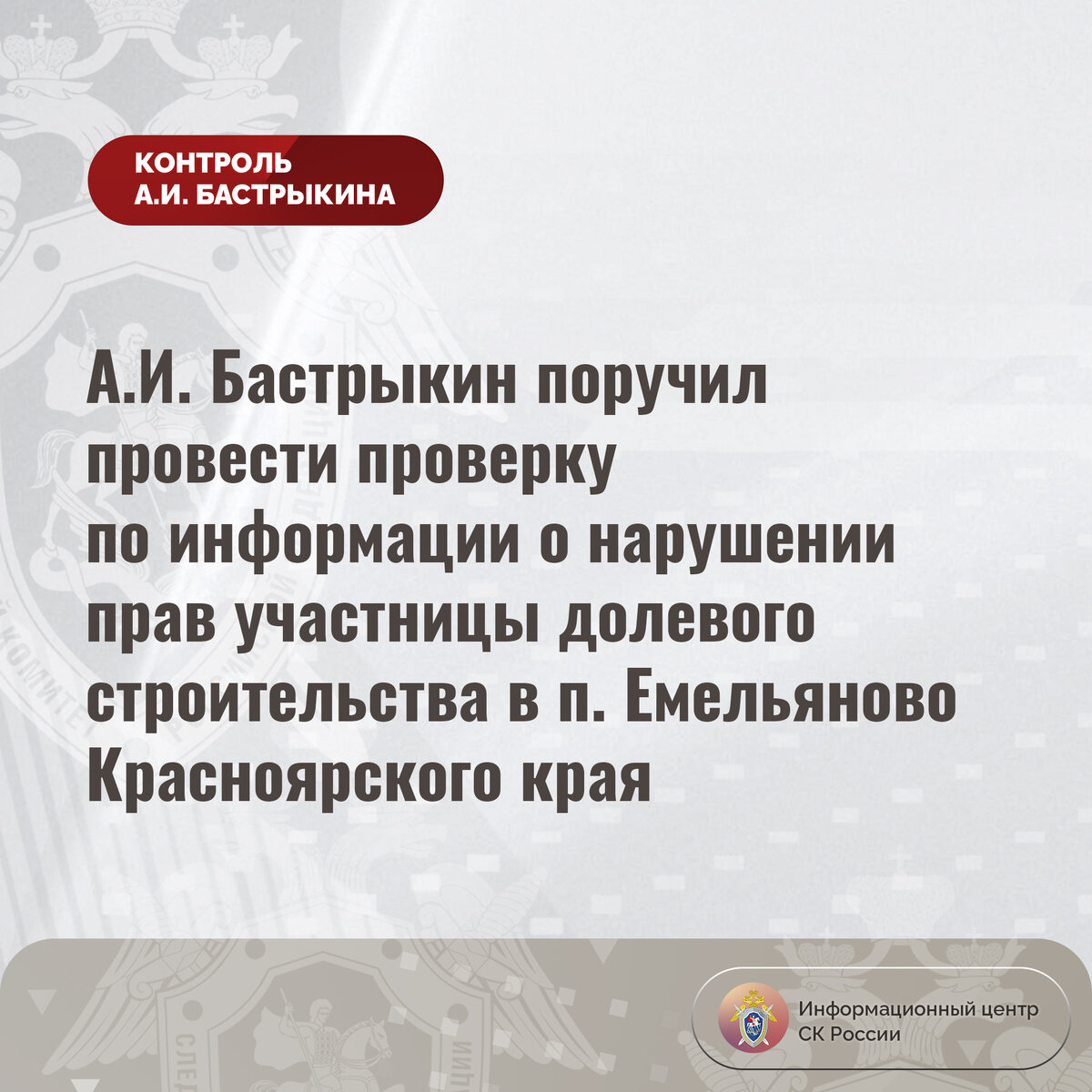А.И. Бастрыкин поручил провести проверку по информации о нарушении прав участницы долевого строительства в п. Емельяново Красноярского края