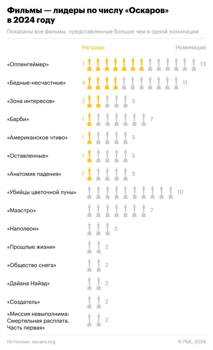 Блокбастер Кристофера Нолана об американском физике и «отце атомной бомбы» Роберте Оппенгеймере завоевал семь статуэток премии «Оскар», в том числе за лучшие режиссуру, главную мужскую роль (Киллиан Мерфи), а также главную награду — «Лучший фильм». Картина была абсолютным лидером по числу номинаций: драма претендовала на награды в 13 категориях. Фильм о Роберте Оппенгеймере вышел в мировой прокат летом 2023 года. К февралю он стал самым кассовым байопиком в истории, собрав $958 млн. Картина получила пять наград на премии «Золотой глобус», в том числе за главную мужскую роль, семь наград BAFTA, три — Гильдии киноактеров США. Аналитики называли «Оппенгеймер» фаворитом «Оскара» в главных номинациях. Четыре статуэтки получил абсурдистский фильм «Бедные-несчастные» Йоргоса Лантимоса. За работу в картине Эмма Стоун была удостоена «Оскара» в категории «Лучшая женская роль», лента также взяла награду за лучшую работу художника-постановщика, лучшие костюмы, грим и прически. Драма об Освенциме «