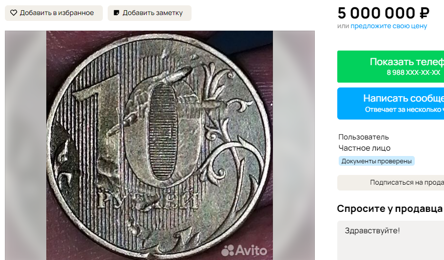 В Волгограде снова решили «порадовать» нумизматов —на этот раз монетой с браком за 5 миллионов рублей. Соответствующее предложение появилось на сайте бесплатных объявлений. Продавец из Кировского района предлагает 10-рублевую монету 2012 года с «очень красивым заводским браком». Коллекционерам представлены брак аверса и реверса и засорение штемпеля, и, как утверждает владелец, вряд ли такие есть. При этом продавец попытался оградить себя от насмешек. — Монета оригинал. Ничего не покупаю, не консультирую, тех, кто пишет глупости и гадости, сразу в бан. Реальному покупателю торг, —заявляет волгоградец. Объявление было размещено 3 марта, но пока, по всей видимости, желающих приобрести монету не нашлось. Ранее житель Краснооктябрьского района разместил объявление о продаже уникальной монеты с двумя номиналами «всего-то» за 63 миллиона рублей. Подписывайтесь на наш телеграм-канал — там собрано все самое интересное. Анна Анатольева
