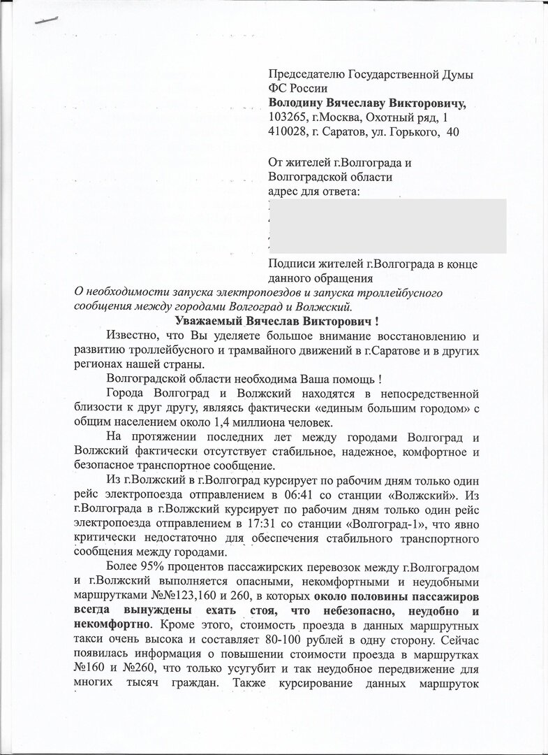 Группа волгоградских энтузиастов попросила председателя Госдумы Вячеслава Володина запустить электрички и троллейбусы между двумя городами. Как гласит коллективное обращение, это необходимо для замены пригородных маршруток на троллейбусы, так как на протяжении последних лет между городами Волгоград и Волжский фактически отсутствует стабильное, надежное, комфортное и безопасное транспортное сообщение.