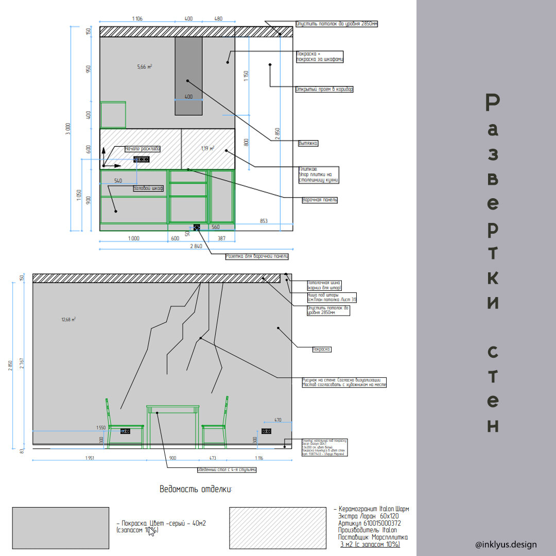 Для начала разберемся, что это такое развертка стен. Это фронтальная проекция стены, на которой отображены все элементы, примыкающие к ней. Представлена она в виде чертежа, на котором можно увидеть типы покрытий, отделки, размеры и расположение всех декоративных элементов, таких как ниши, декоративное панно, бра, выступы. Подробные развертки снимают вопросы заказчика о том, как будет выглядеть каждая стена и помогает ему контролировать процесс ремонта, если не была заказана услуга авторского надзора. Также развертки нужны, если на стенах планируется сложный декор, например, молдинги или карнизы. На развертках выявляются и решаются моменты, которые тяжело учесть и показать на планах, например, высота карниза — чтобы карниз совершенно случайно не закрыл окно. Чтобы тщательно подобранная и полюбившаяся за время проектирования мебель не закрывала доступ к розеткам и прочие не такие очевидные, но важные моменты». Развёртки закрывают следующие моменты: 1. Уровень высоты размещения каждой ко