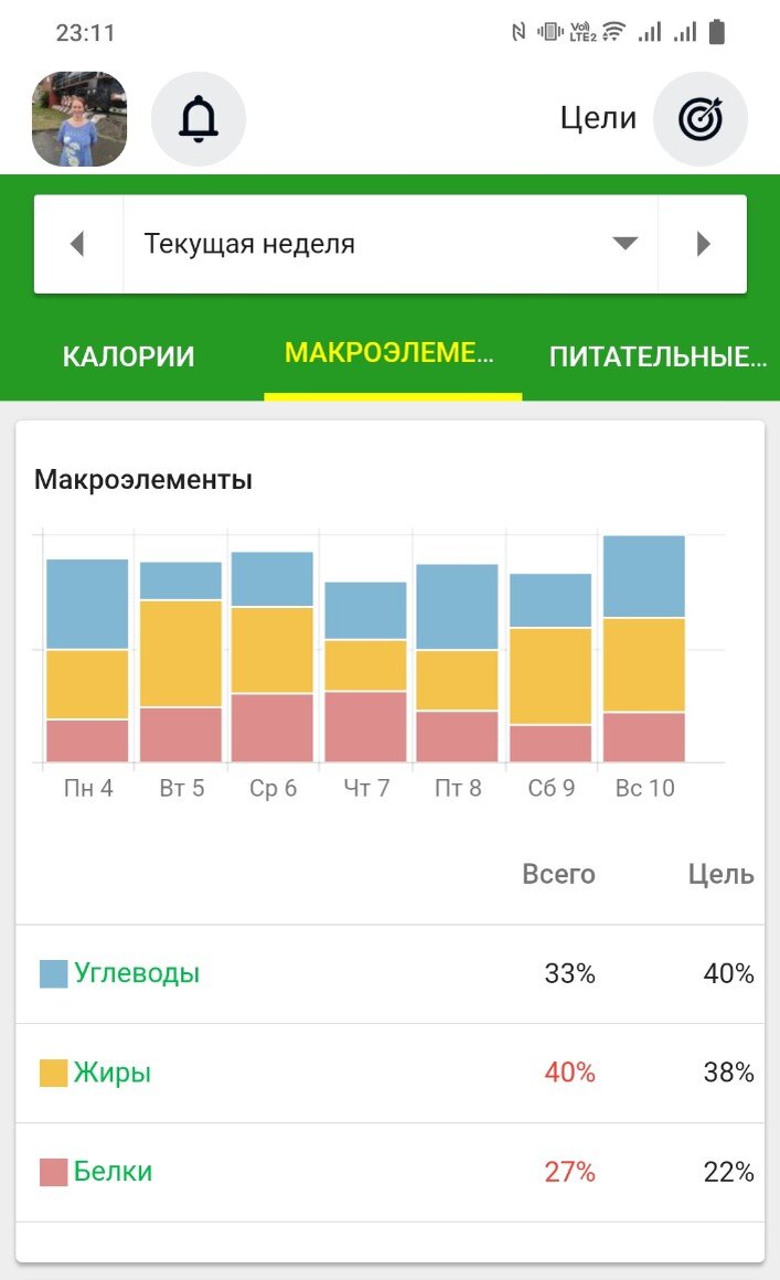 Вот и пролетела ещё одна неделя моего пути к стройности! Праздничная и вкусная! Снова переедала. В таблице за неделю зашкаливают жиры! Ну и очень хорошо, что белки!))Несмотря на праздничные конфетки и шоколадки, углеводов я недобрала. Всё же получилось небольшое ежедневное превышение. Это всё баранки, узбекские лепёшки и колбаса, купленные мужем накануне.)) На прошлой неделе у меня был большой привес! Мы были в гостях и целых три дня я себе ни в чём не отказывала. Вот тут результаты моих загульных дней. С понедельника, стала считать ,как обычно и удалось хорошо сбросить набранное. Думаю, что все-таки многие, проккоментировавшие прошлую статью-отчёт, были правы. Набранное, в основном было водой и гликогеном. Иначе бы за неделю, при небольшом дефиците, мне не удалось бы столько сбросить. А ушло много! Аж минус 1,6 кг! Как пришли, так можно сказать и ушли! 💪👍🔥 Конечно прилипло 200 гр. Ну ничего. Идём дальше. Объёмы прежние. Какие выводы сделала?! Смысла в жевании салата в праздник нет