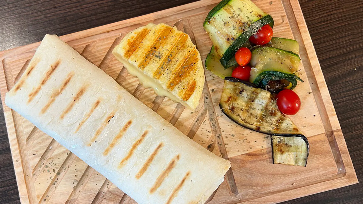 В дополнение к шаурме приготовила на гриле цукини и баклажан. Порезала овощи вдоль тонкими полосками и готовила с закрытой верхней панелью на максимальной температуре — на это ушло пять минут. Чтобы добавить ужину греческих ноток, пожарила сыр халуми. За пару минут бледный кусочек превратился в румяный и аппетитно расплавленный.