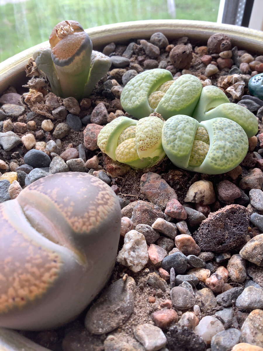 Прошлой зимой я стала счастливой обладательницей собственноручно созданного литопсного садика. Изначальные фотографии его я уже выкладывала, так что не буду повторяться. С тех пор вид его заметно изменился, так как некоторые образцы я потеряла, взамен них появились новые. Иные сильно разрослись, как заметный на всех фото мой любимец - салатовый экземпляр Здесь же пройдемся по указанному отрезку времени и посмотрим, как литопсы пережили зиму и начали новый цикл линьки. Заранее скажу, что некоторые отличились. И это даже не салатовый, который за пришлый сезон сменил аж две пары листьев, что само по себе противоестественно. Не крупный коричневый, который линьку того года вообще решил пропустить и так и достоял кирпичиком до этой весны. Позднее всех подсаженные маленькие красные тоже придерживались желаемого темпа Лишь один скромный коричневый с отсветшим бутоном решил, что ему нужно тронуться в рост зимой и безбожно вытянуться🤷🏻♀️ Он и до этого не числился в любимчиках, зато теперь мн