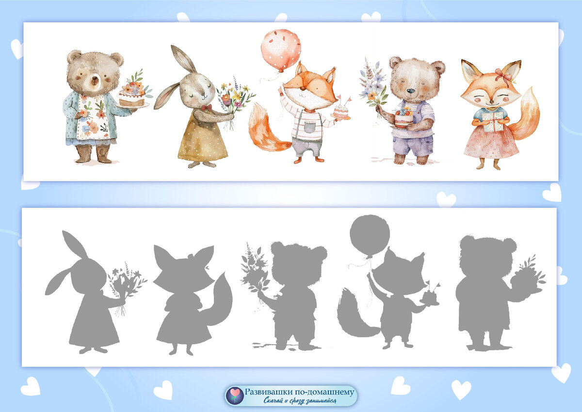 Посмотрите внимательно на картинку и найдите тень каждого персонажа 🎈🎁🎀 Про игру на липучках с этими персонажами смотрите здесь (+ссылка, где можно скачать шаблон):