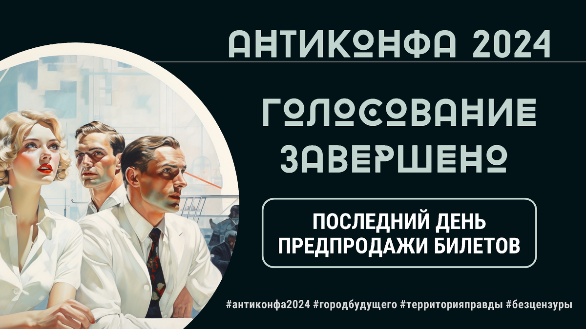 Поздравляем, вы выбрали своих героев! Вчера завершилось голосование за лучшие темы для АНТИКОНФЫ-4. Сегодня мы формируем программу TED-сессий и Мастерских, и уже завтра представим вам ее финальный вариант. Это значит, что сегодня – последний день, когда вы можете купить билеты на АНТИКОНФУ со скидкой 50%. После публикации программы предпродажа билетов будет окончена. ⚡Успейте забрать билет за полцены 📱 Присоединяйтесь к чату АНТИКОНФЫ