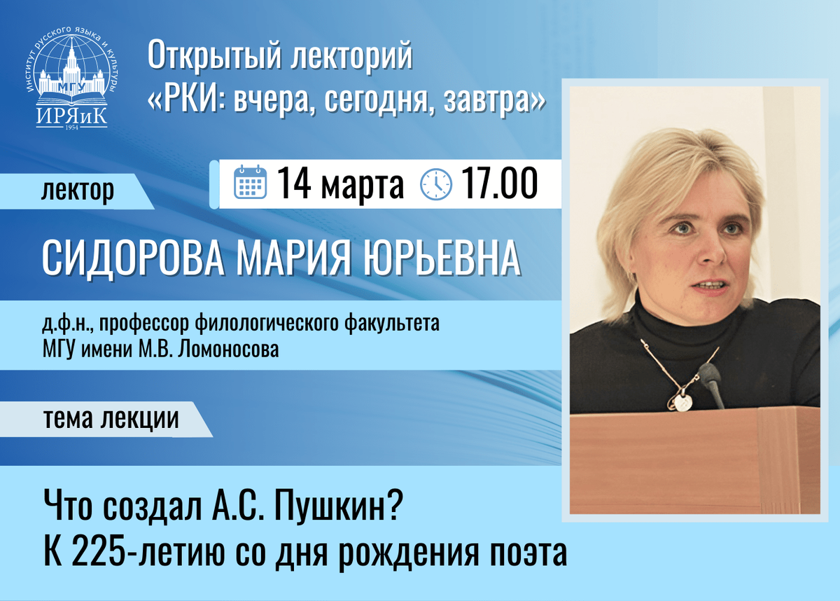 Уважаемые коллеги! Открытый лекторий «РКИ: вчера, сегодня, завтра» продолжает свою работу. 14 марта в 17.00 приглашаем вас на лекцию д.ф.н., профессора филологического факультета МГУ имени М.В. Ломоносова М.Ю. Сидоровой на тему «Что создал А.С. Пушкин? К 225-летию со дня рождения поэта». Будем рады видеть вас очно или онлайн.