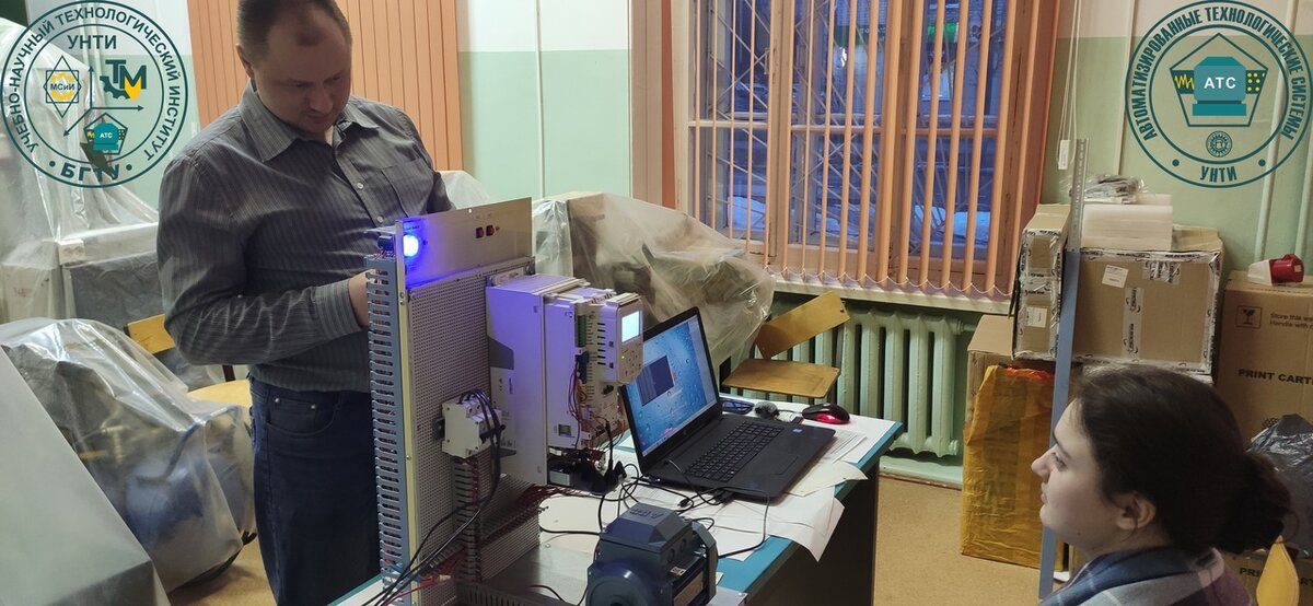 На кафедре "Автоматизированные технологические системы" проходит производственная практика (НИР) в магистратуре. Магистрант 2 курса Мишина М.В. собирает раннее спроектированный ею стенд на базе программируемого логического контроллера (ПЛК), частотно-регулируемого привода (ЧРП) и электродвигателя. На фото изображены пуско-наладочные работы, состоящие из тестирования ЧРП и программирования ПЛК. Подобное оборудование обычно используется в системах водоснабжения с автоматическим управлением частотой вращения насоса. ПЛК служит для обеспечения связи с диспетчерским пунктом с помощью цифровой сети Modbus TCP.