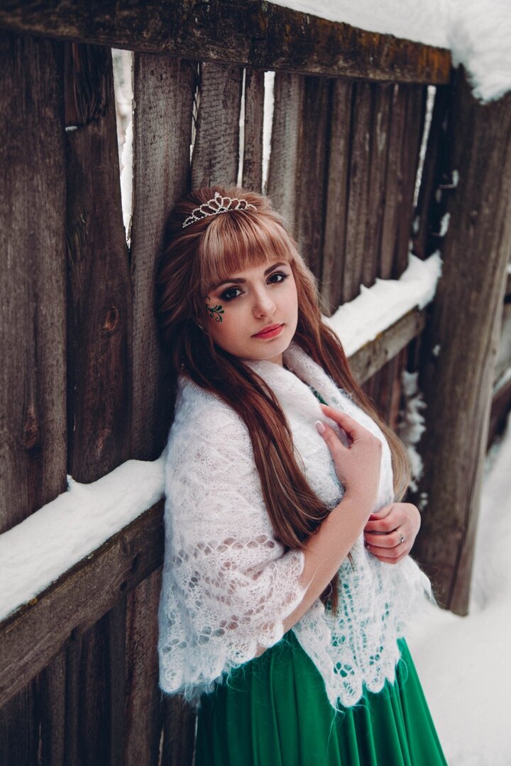 Оригинальная фотосессия получилась, нестандартная. Фея леса, но зимняя, северная. По-летнему зеленое платье напоминает о том, что тепло скоро придет, а пока что можно любоваться отражениями снега и льда в ее диадеме.