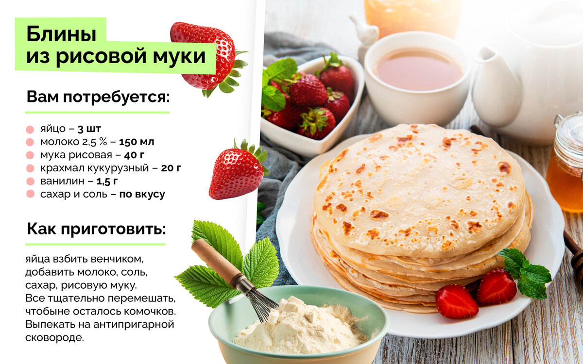 Сегодня в меню - блины из рисовой муки! Но что про этот рецепт говорят наши диетологи? Читайте ниже: В блинном тесте вполне допустимо заменять один вид муки на другой. Блинчики из рисовой муки получаются тонкими и хрустящими, подавайте их с йогуртом и свежими ягодами или фруктовым салатом. Приятного аппетита!