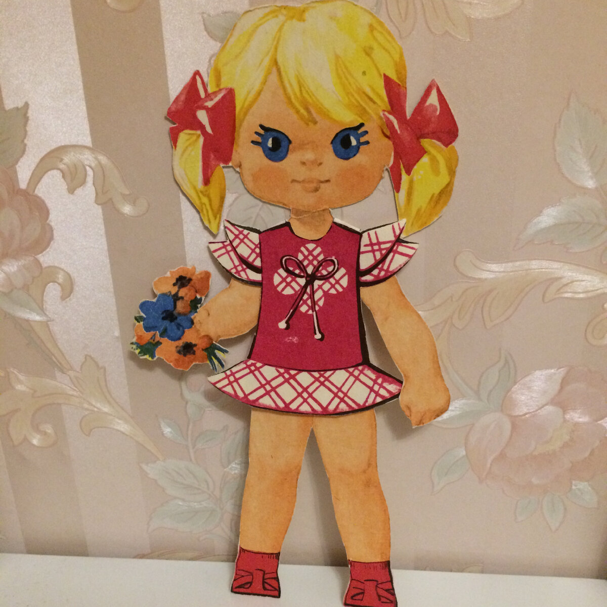 Добрый день, дорогие читатели! Сегодня хочу показать вам одну советскую куклу, которая сохранилась у меня с детства. Набор, о котором пойдет речь, как и подавляющее число наборов того времени, назывался нехитро - "Одень куклу" (это, кстати, очень затрудняет идентификацию). В наборе было две куклы, и нам купили его на двоих с сестрой. Кукла сестры не сохранилась, она вообще к бумажным куклам относилась более спокойно, чем я. Моя же дожила до сегодняшнего дня, причем в весьма хорошем состоянии. Итак, знакомьтесь: Элеонора: Немного об имени. Я как-то писала, что пока я была совсем маленькой, большой фантазии насчет имен я не проявляла: если в наборе было две куклы-девочки, я давала им наши с сестрой имена, если мальчик и девочка, то называла в честь мамы с папой. А Эля - это уже следующий этап. Я стала постарше и, очевидно, меня потянуло на имена более вычурные. Во всяком случае, примерно тогда же я переименовала своего плюшевого зайца Степашку в Родиона)) А бумажных Элеонор у меня было ц