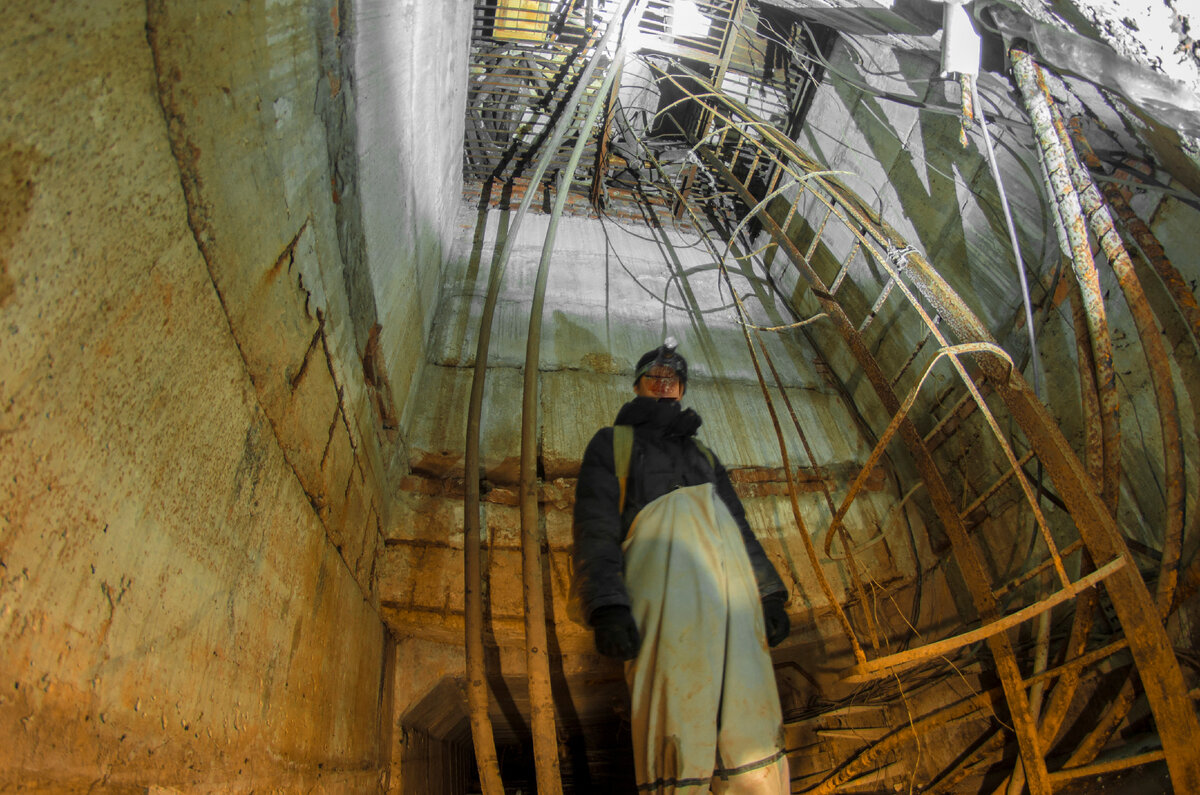 Наша команда продолжает исследовать промзону славного града на Волге. Очередная ночь открыла нам неизвестные ранее недра обетованной, поманив довольно монструозного вида вентиляционной шахтой. Пробираемся к ней по пояс в сугробах, дверца приоткрыта, это удача! Немедленно спускаемся и начинаем осмотр объекта. Внизу лёд, на первый взгляд достаточно прочный. В сторону, во тьму подземелий, уходит портал коллектора, нам прямиком туда. Высвечиваем бесконечную даль проёма фонарём, по стенам тянутся старые, покрытые многолетней ржавчиной, высоковольтные провода, слышен электрический гул трансформаторов, ведь над нами во всю работает понизительная подстанция. Ледяные сталактиты и сталагмиты выглядят очень живописно, аккуратно следует двигаться вперёд, дабы не нарушить этой красоты и не провалиться под лёд. Через 300 метров мы оказываемся на развилке, гул трансформатора слышен намного отчетливей. в одну из сторон тянется длинная "кишка" коллектора, следует проверить это направление. Плафоны под