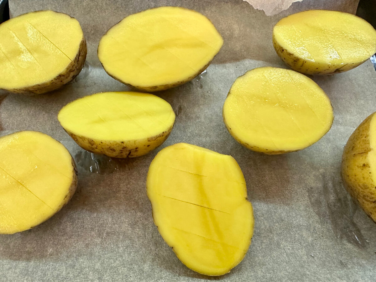 Совсем скоро начинается Великий пост. Я прочла, что в сложные дни сухоядения допускается употребление запеченных овощей и фруктов без использования масла и в холодном виде. Это всегда вызов фантазии- изобрести вкусное из того, что можно. Итак, начнем! Будем готовить картофель, запеченный в мундире без масла. нам потребуется: На противень кладем бумагу для запекания. Картофель моем, разрезаем на половинки, выкладываем на противень. На каждой половинке картофеля делаем неглубокие надрезы: Далее готовим «начинку». Чистим дольки чеснока, количество на ваш вкус. Розмарин измельчаем (у меня он уже в готовом виде). Чеснок давим на чеснокодавилке. Смешиваем вместе розмарин, соль и чеснок. Выкладываем поищи смеси чайной ложечкой на каждую половинку картошки. Равномерно распределяет смесь по картофелю. Я старалась раскрыть надрезы, чтоб при втирании смесь вошла поглубже. Включаем духовку на разогрев. Когда духовка нагрелась и все наши половинки тщательно пропитались ароматной смесью, отправля