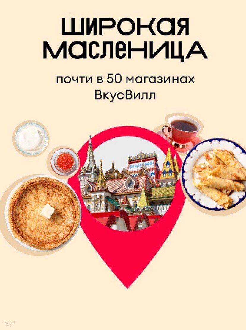 Дата: с 11 по 16 марта 2024 года магазины ВкусВилл устраивает Масленицу и приглашает гостей на викторины, конкурсы с призами, а также на бесплатную дегустацию блинчиков Время проведения: с 16:00 до 20:00 Место: г. Москва, магазины ВкусВилл по указанным в расписании адресам Подробности ТУТ Ну а если у ты не живешь в Москве или просто нет возможности посетить указанные магазины, то закажи доставку 🚚 С промокодами на первый заказ станет еще и дешевле 🤩