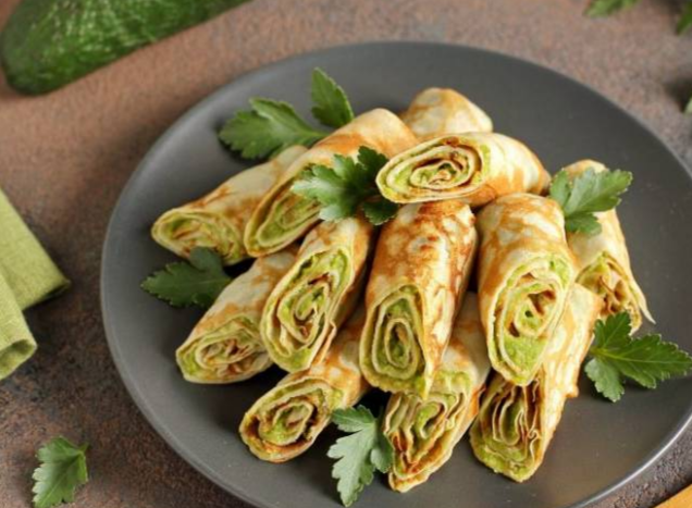 - Подача: Сверните блины в рулет и украсьте их оставшимися кусочками авокадо и свежими овощами.