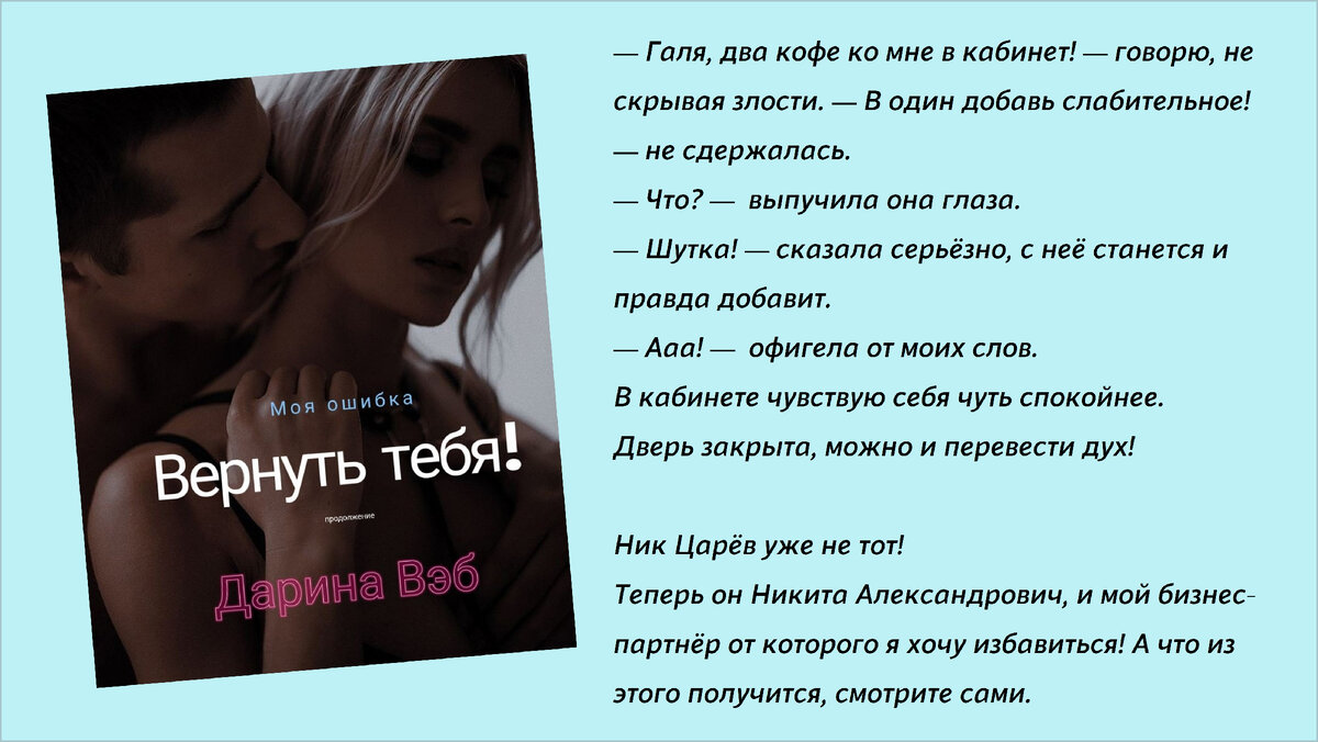 Приглашаю познакомится с жаркой историей о непростых отношениях, новинка на площадке Литент от моей коллеги! Дарина Вэб ВЕРНУТЬ ТЕБЯ Он подаёт руку, я специально игнорю! Берусь за верхнюю ручку, и сама карабкаюсь в этого огромного монстра! Умещаю попу на сидушке и складываю руки на коленях смотря вперёд.