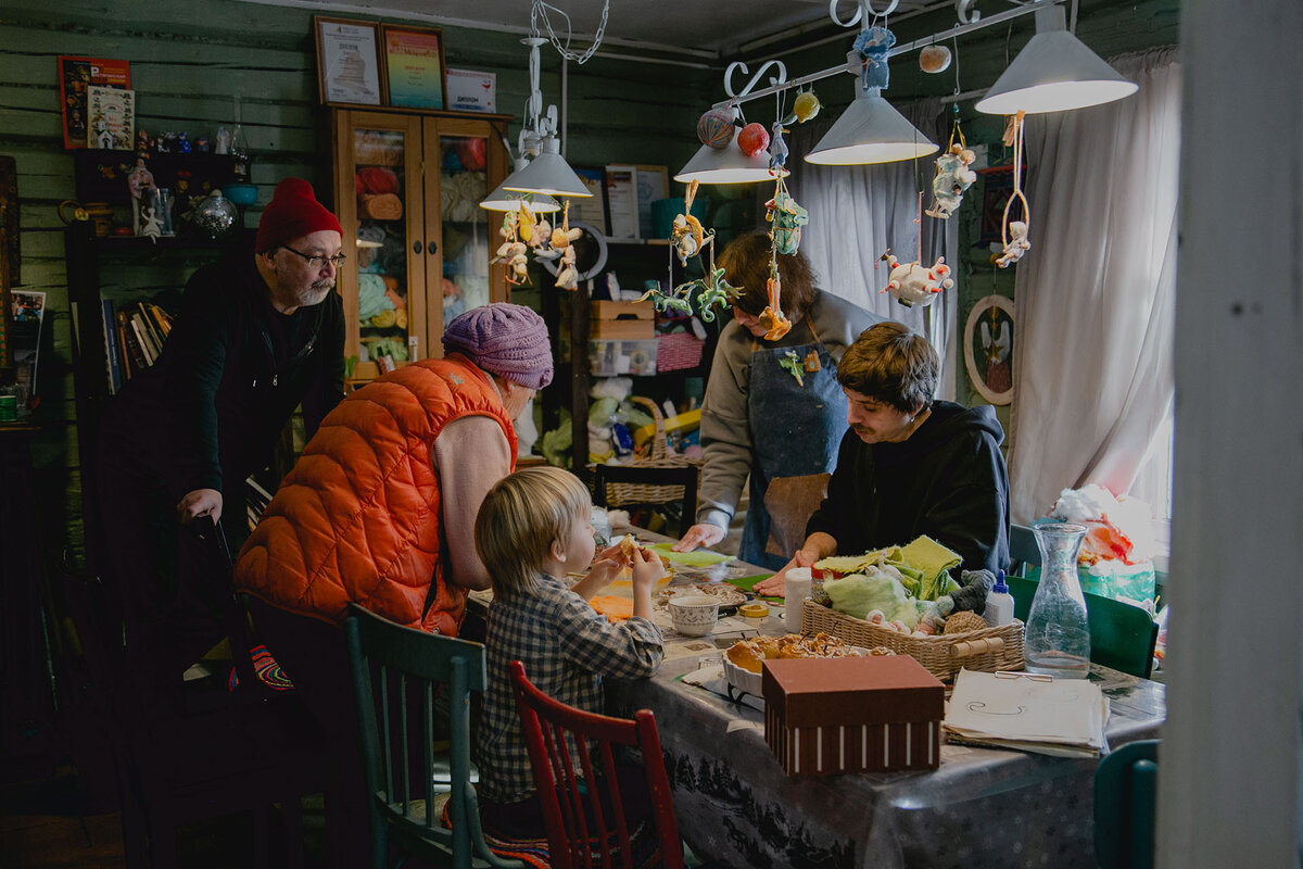 — Наша политика: для местных все бесплатно, — говорит Валерий. — Очень грустно смотреть, как села загибаются, деревни становятся пустующими и депрессивными, хочется делать что-то, чтобы это менялось. Гостям и туристам проводим платные мастер-классы. Месяц перед Новым годом мастер-классы проходят почти каждый день, в обычное время стараемся пореже, чтобы было время на работу. Несколько раз мы начинали вести группы, на которых полноценно учили делать игрушки, но обычно через 3–4 занятия люди пропадают: чаще всего их запрос — найти работу, но быстро стать мастером, чьи работы продаются, не получится, нужно потратить силы.