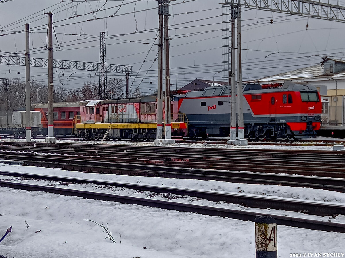 Сегодня коротенький рассказ из прошлого. Опять? Ну да, только не настолько глубоко назад, как с «Аэроэкспрессами». Всего лишь лето-осень 2023 года. Две фотографии из города Орехово-Зуево (со станции и не только) за авторством Игоря Ефремова, за что ему большое спасибо. Ну а теперь минутку-другую посвятите этому рассказу. 1. Итак, для начала октябрь 2023. На фоне электровоза ЭП2К с вагоном-лабораторией наблюдается тепловоз ЧМЭ3 весьма странной окраски. Хотя, второй взгляд говорит о том, что в общем-то все стандартно, только практически выцвело. Давно тепловоз не был на покраске. 2. А вот эта фотография более любопытная. Тут целое «стадо» маневровых тепловозов и часть из них нестандартно синего цвета. Логично предположить, что тепловозы не для РЖД, а какой-то частной компании. И по этому предположению переходим к третьей фотографии. 3. Так вот, эта фотография сделана уже не в Орехово-Зуево, а чуть ближе к Москве, неподалеку от станции Электроугли. Сейчас там огромный контейнерный термина