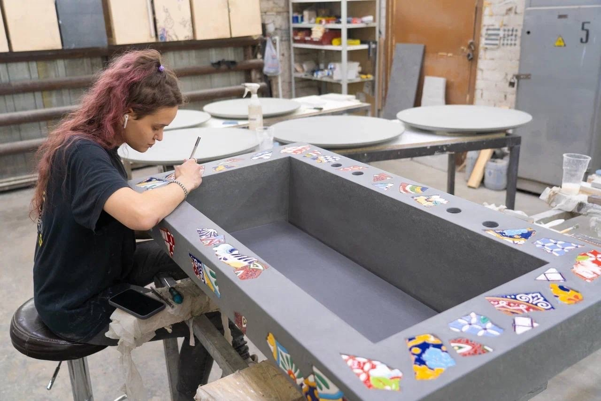 Есть на Урале такая компания - Петробетон. Ребята создают шедевры из архитектурного бетона - бетонные раковины, столешницы, предметы интерьера, мебель и многое другое. Получается очень круто! Но некоторые работы особенно восхищают, и сейчас мы покажем одну из них: На первых фотографиях – процесс работы нашей художницы над раковиной для частного интерьера. А вот, что из этого выйдет: Как вам такой интерьер ванной? А сама раковина? Напишите в комментариях, очень интересно!