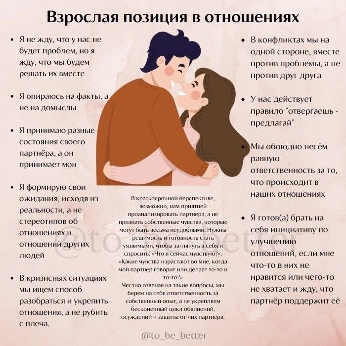 Многие из вас мечтают о большой любви, взаимоотношениях, наполненных страстью, нежностью, заботой. Женщины утверждают, что они хотят чувствовать себя с мужчиной, как за каменной стеной. Мужчины стремятся ощущать опору и поддержку со стороны второй половины. И нередко подобные желания ни к чему не приводят. Партнеры перекладывают ответственность за любовные неудачи на вторую сторону, а иногда винят весь противоположный пол. На деле же необходимо просто разобраться, какие виды отношений между мужчиной и женщиной бывают, проанализировать собственное поведение, действия партнера, прийти к компромиссу. Сразу стоит оговорить, что со временем взаимоотношения в паре могут меняться. Вы становитесь ближе, узнаете друг друга, меняете собственные и общие приоритеты. Если оба партнера готовы работать над собой, не «играют в одни ворота», то такая пара может пройти путь до здоровых, зрелых взаимоотношений, где каждый ценит свою половину, уважительно относится ко всем его потребностям, желаниям. Псих